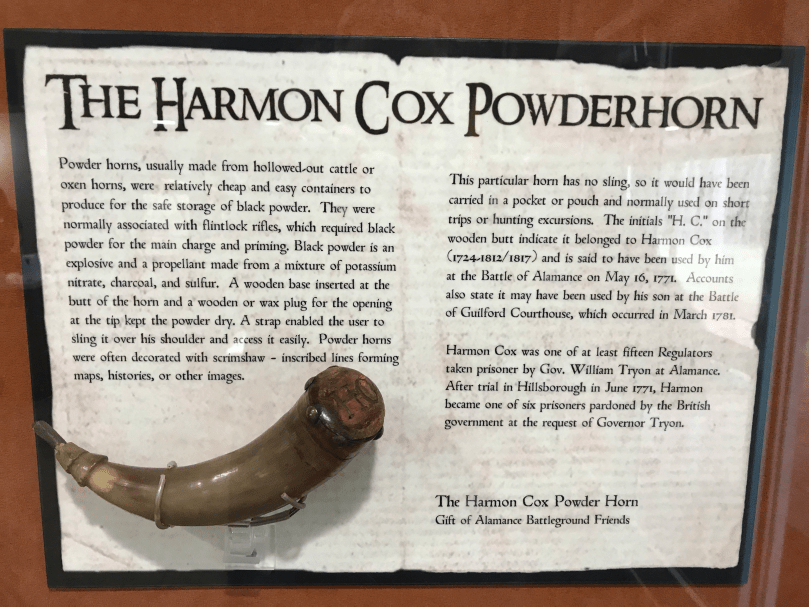 A small powderhorn used by Harmon at the Battle of Alamance was carried by Herman Husband when he fled North Carolina to Somerset County, Pennsylvania. It was donated to the Alamance Battlefield North Carolina State Historical Site by a descendant, Nick Sheedy, in 2008.