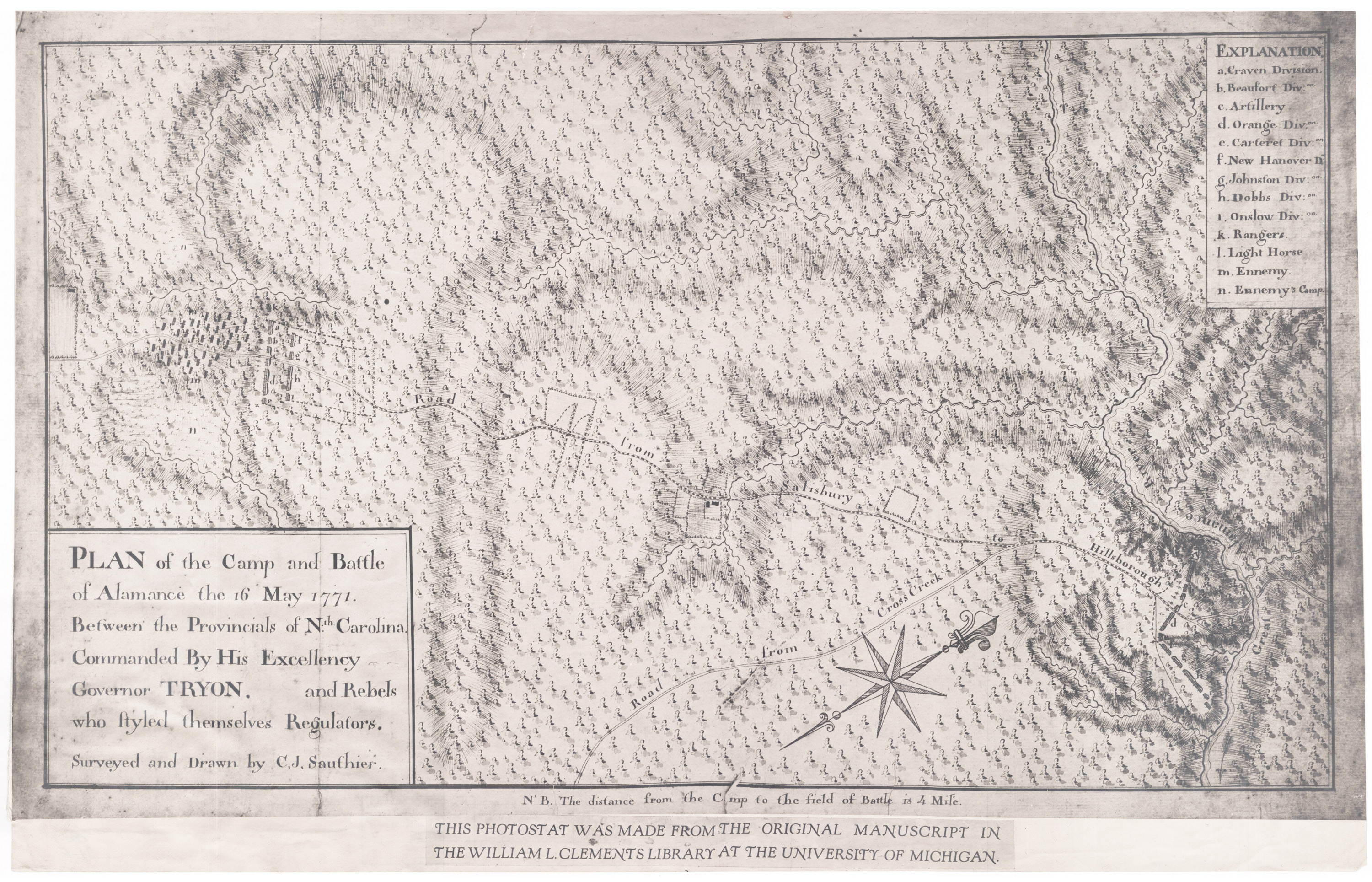 Between 1764-1771, farmers in today’s Alamance, Chatham, Guilford, and Randolph counties became disgruntled with local colonial officials and the levy of taxes. These farmers, who became known as “Regulators,” drafted petitions to the Governor of North Carolina, William Tryon. Some historians suggest participants in the “Regulator movementinspired the Sons of Liberty and their activities in Massachusetts and vice versa.