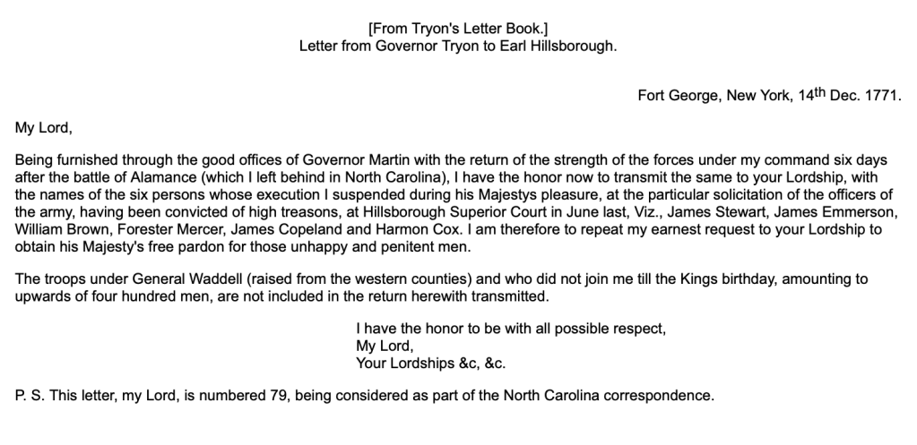 At the Battle of Alamance on May 16, 1771, the militia of Royal Governor William Tryon defeated approximately 2000 Regulators. The estimated deaths and casualties varies among articles, but it’s certain that twelve Regulator prisoners were tried in Hillsborough after the battles. Six were hanged and six were pardoned, Harmon being one of the lucky ones.