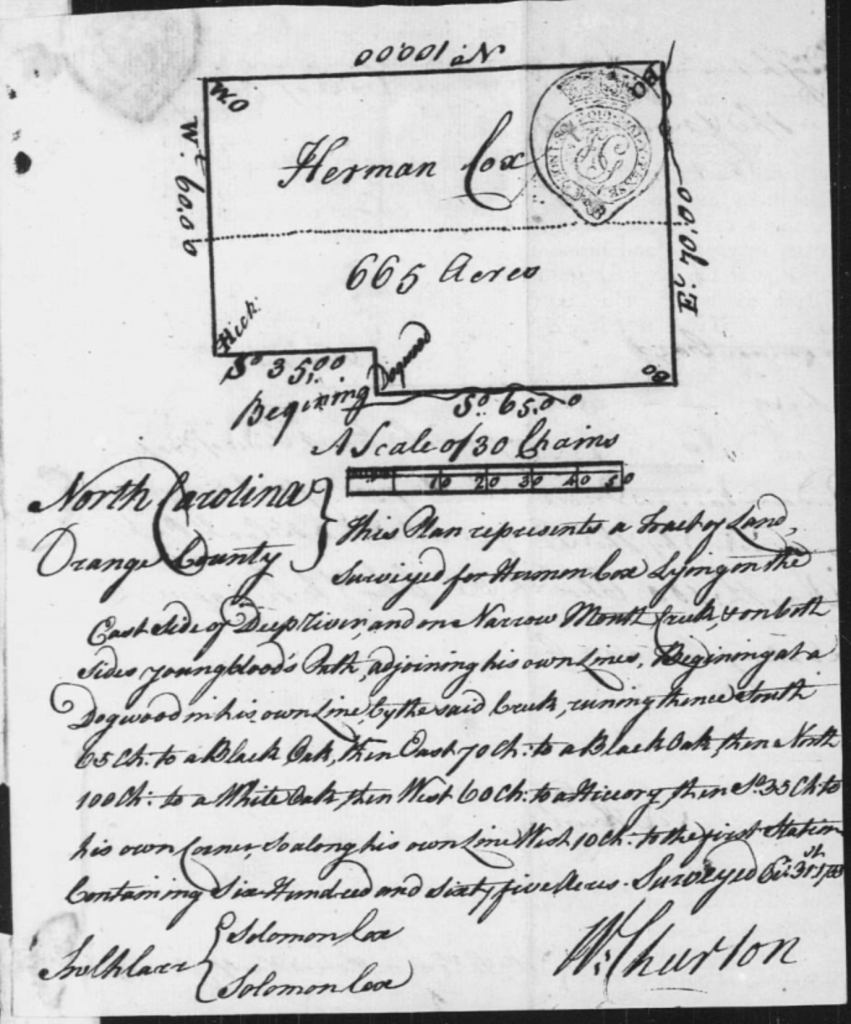 • Thomas Cox, brother of Harmon and Solomon, attended the 1768 Regulator meeting held at his mill, signed the Regulator advertisement, and was at the Battle of Alamance.