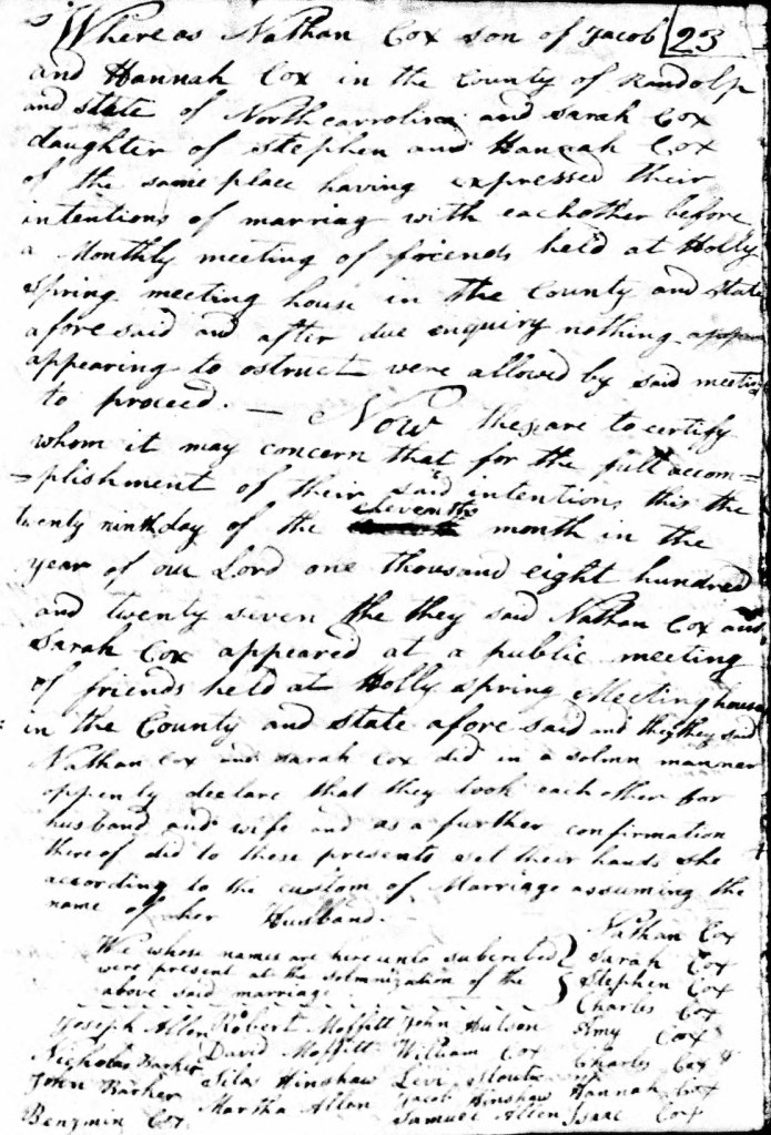 Thomas and Harmon are brothers, sons of William Cox. (William, Jr, John, and Solomon were the other brothers.) The Coxes were Quakers, and discouraged from marrying outside the faith. As one might imagine, this limited the marrying pool considerably. Thomas’s granddaughter Sarah married her cousin Nathan (Harmon’s grandson) producing my 3rd great grandfather Calvin Cox.