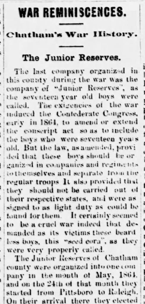 A month later, on April 26, General Joseph Johnston’s surrendered his army of 90,000 to General William T. Sherman at Bennett’s Farm near Durham, sparing North Carolina the destruction seen in Sherman’s march through Georgia and South Carolina. The final terms allowed the Johnston’s men to keep their personal property and use the army’s wagons and horses to return home. The Junior Reserves, camped near Red Cross in Randolph County, were dismissed to go home.