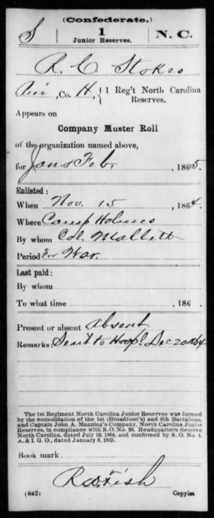 It’s unclear if RC was at any of these battles. His CSA pension application states he was injured from a fall from a bridge. One Confederate veterans reference lists him as being sent to a hospital in December 1864 and “absent” in January-February 1865.