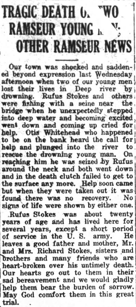 RC then married Emma Dora Phillips in 1890 and they had nine children together: Sarah (1891), Arthur (1894, died after 12 days), Orron (1895), Alma (1899, my maternal grandmother), Richard (1901), Rufus (1903), Ocia (1906), Causey (1908), and Thelma (1911). Rufus drowned in 1922 while fishing on Deep River.