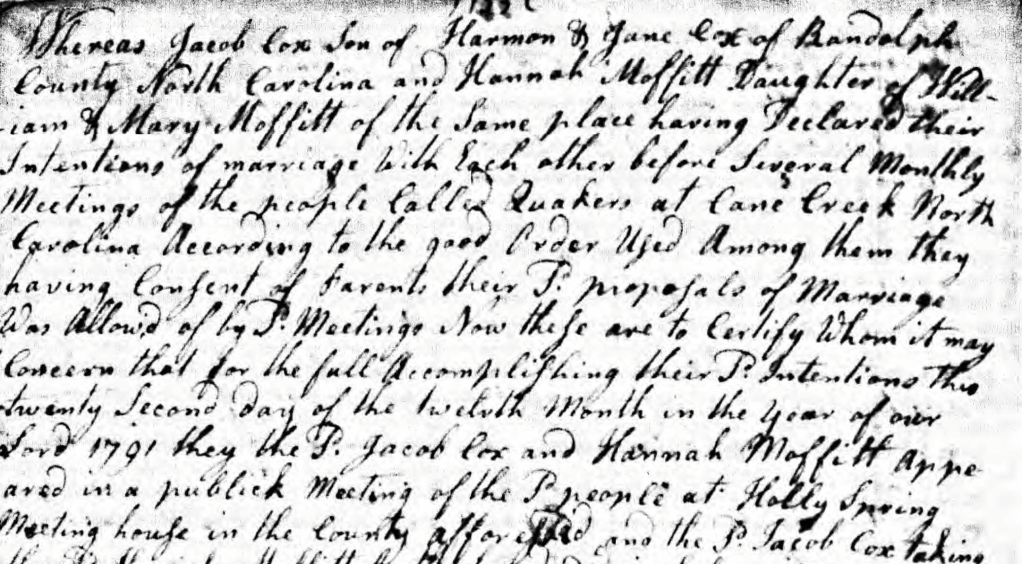 He married my 4th great grandfather Hannah Moffitt on December 22, 1791 and the marriage was reported to the Holly Springs Friends and Cane Creek Friends Meetings. Hannah was the daughter of William Joseph Moffitt and Mary Davis Moffitt. (Hannah’s older sister, Catherine, married Elisha’s older brother, Nathan, in 1789.)