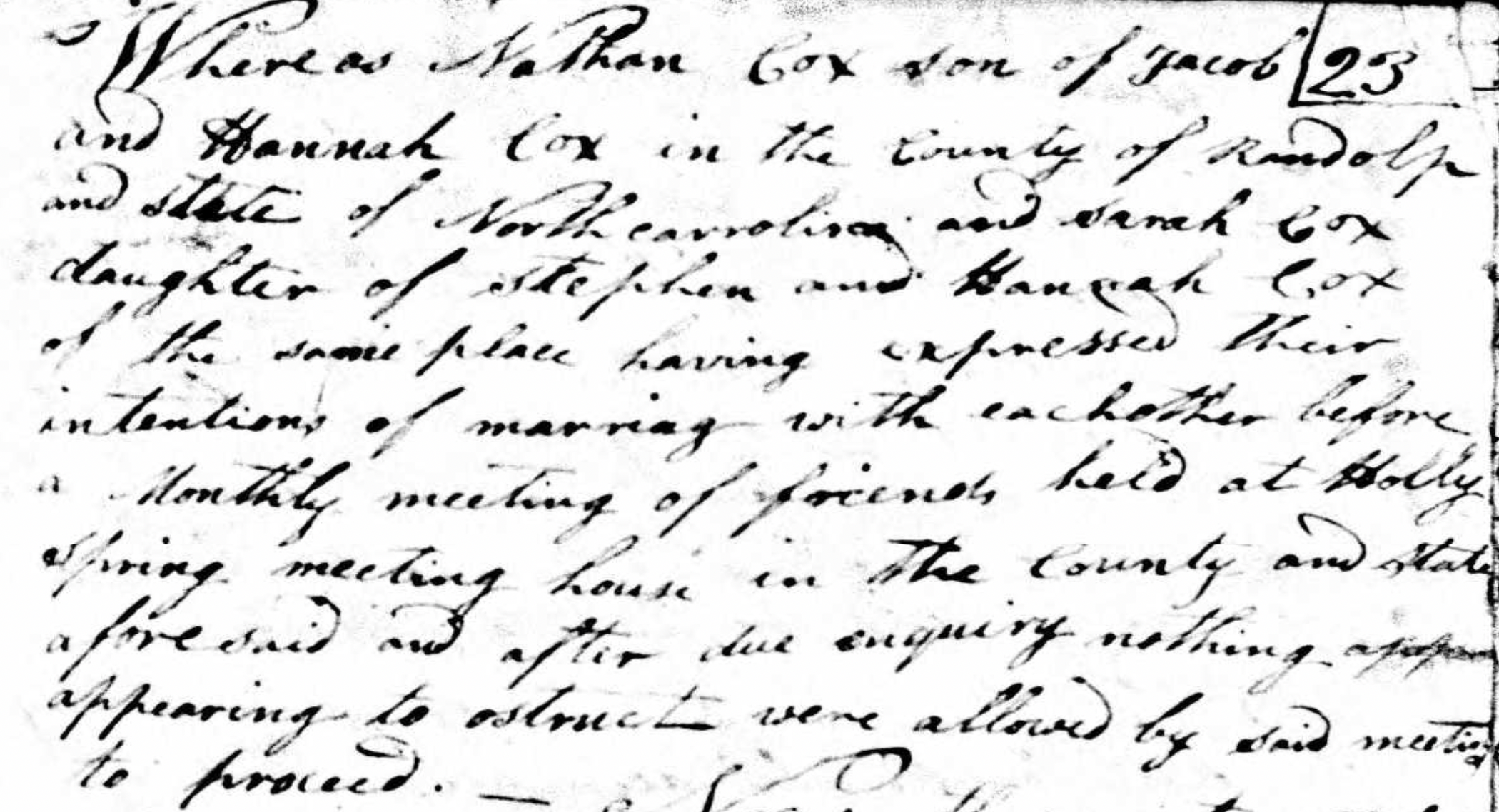 Nathan W. Cox is my 3rd great grandfather. He was born on October 20, 1804, in Randolph County, NC to Jacob and Hannah Moffitt Cox. (This Nathan is sometimes confused with a cousin named Nathan, son of Jonathan Cox and a different Sarah.)