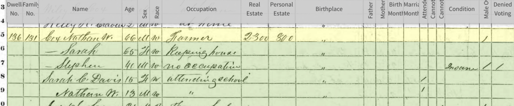 Eliza Ann and Martha Jane married brothers, Jesse and James Davis, from a Pleasant Garden Quaker family. Jesse and died in 1860, and Martha Jane died in 1865. Children with the surname Davis show up Nathan’s household in 1870, and noted in settlement of the estate.