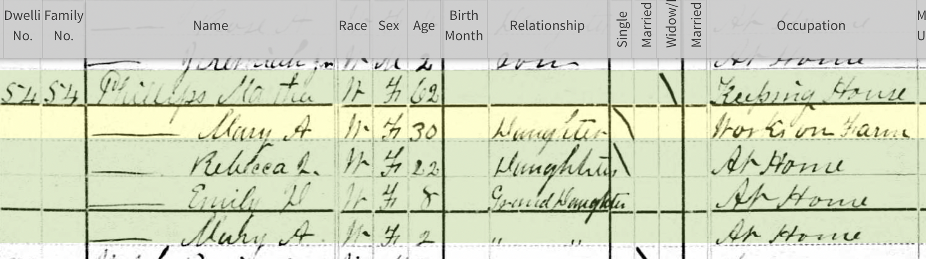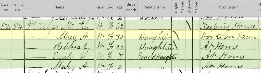 There is no record of Polly Ann and Casander being married or living together. Polly Ann was a single mother living with Dora in her widowed mother Martha’s household according to the 1880 census. (Recorded as Mary Ann). Her sister and another child, perhaps her sister’s daughter, also lived with Martha. The youngest child’s name also appears to be “Mary A.,” so this needs more research.
