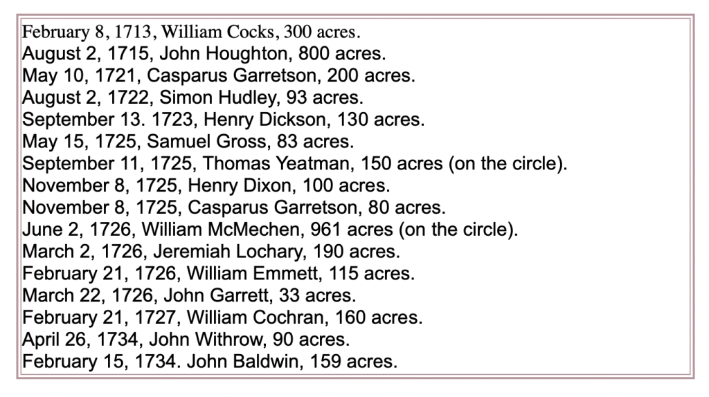 William Cox is recorded in several land transactions in the early 1700s. One record refers to him as “yeoman William Cox” meaning he was a farmer of land he owned. In 1713, William Penn’s daughter, Letitia Aubrey, conveyed a 300-acre tract of land located in Mill Creek Hundred, New Castle County, to William Cox (Cocks). (The date of the conveyance is recorded as February 8, 1713, but some historians note this is the date Letitia authorized legal representatives to conduct transactions on her behalf.) This is notable as my 6th great-grandfather William Cox was born in 1692. Was he acquiring this land, or was this his father? The latter seems most likely.