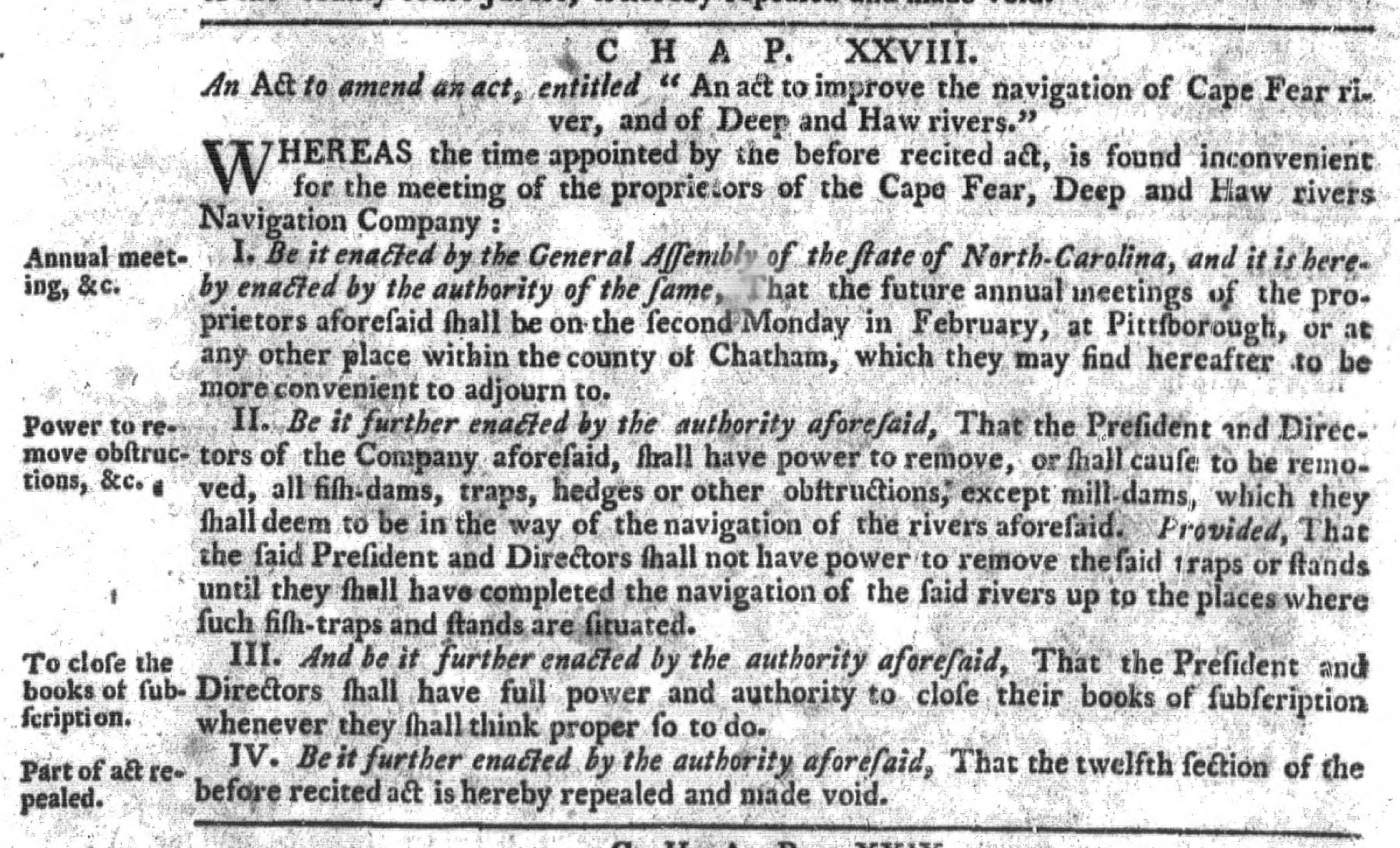 The general notion was to work on narrow, shallow, and rocky areas of the rivers, including the removal of “fish-dams, traps, hedges or other obstructions.” Funding for the company came from the issuance of $8,000 worth of stock at $5 per share. Similar companies were formed in the 1700s-1800s for other NC rivers such as the Yadkin, Tar, Neuse, Catawba, et al.