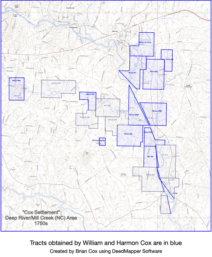 This is a long overdue post regarding an updated map that my west coast cousin Rich Marshall and I are calling “Cox Settlement.” It is a map of the Cox (and related Quaker family) Granville land grants on Deep River and Mill Creek. The map name is taken from references to the area in Cane Creek Friends records of the 1700s..