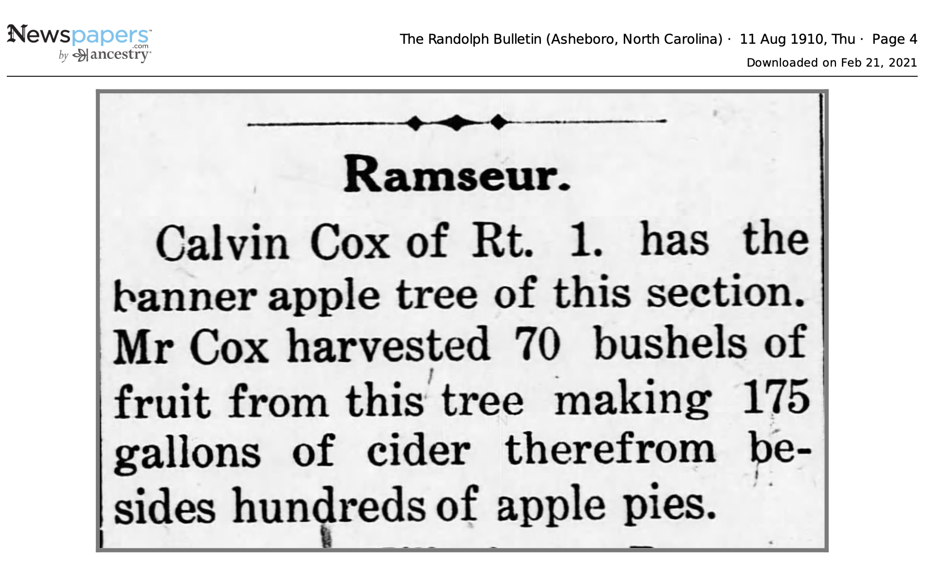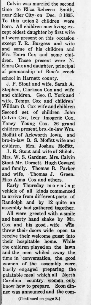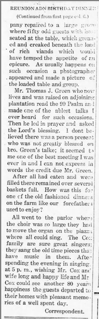 By the 1970s, this reunion gave way to other gatherings such as the (Stephen) Clark Cox reunion (one of Calvin and Sallie’s children, and by great grandfather).