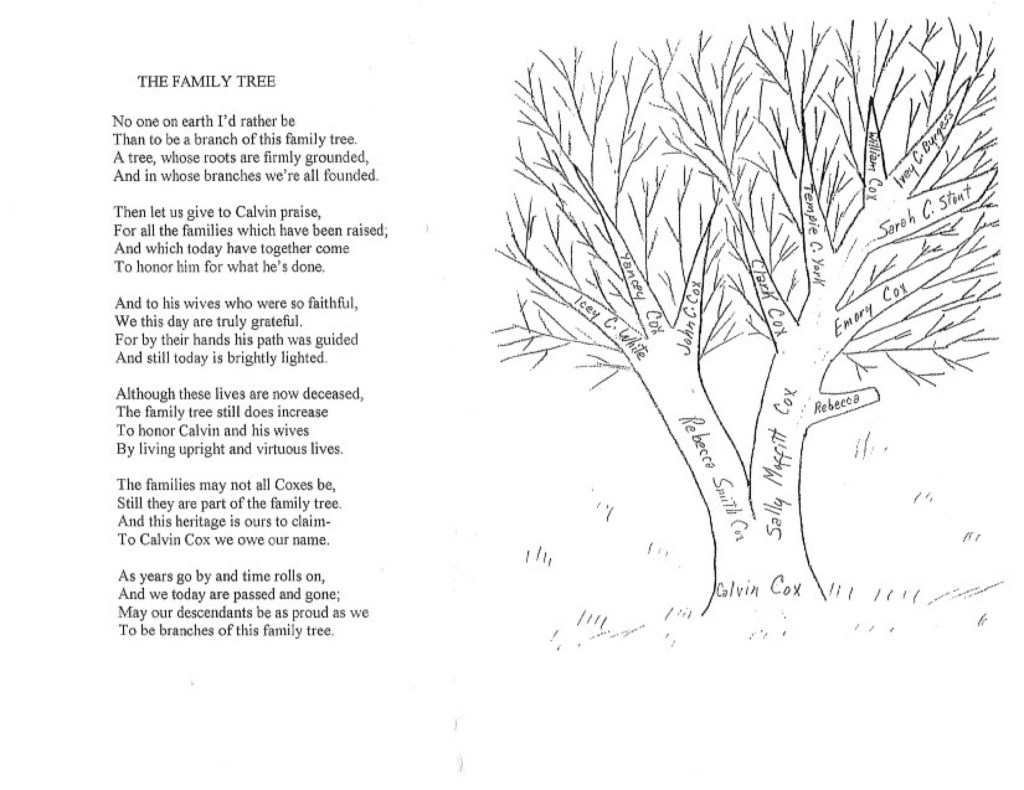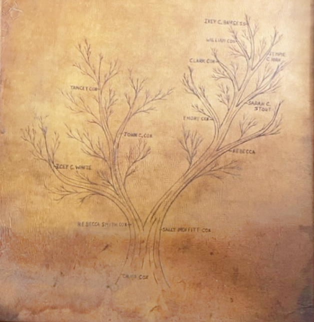 Calvin Cox and Sarah “Sallie” Moffitt Cox are my 2nd great-grandparents. The family tree pictured above illustrates how the reunions of early childhood were organized around descendants of Calvin, Sallie, and Calvin’s second wife Rebecca Smith Cox.