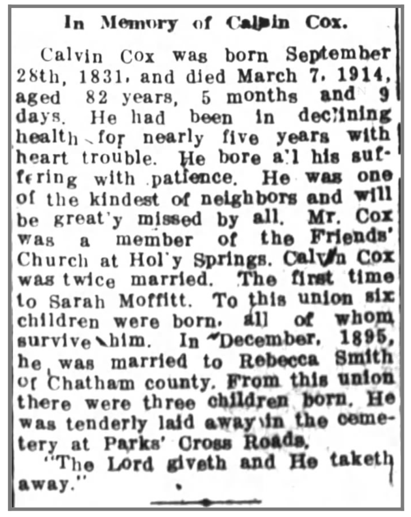 Calvin was born September 28, 1831, at the Cox family home and farm just south of Ramseur in Randolph County, NC. He was one of nine children, and the second oldest boy, born to Nathan and Sarah Cox.