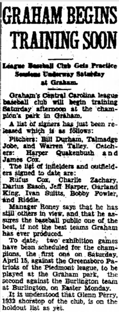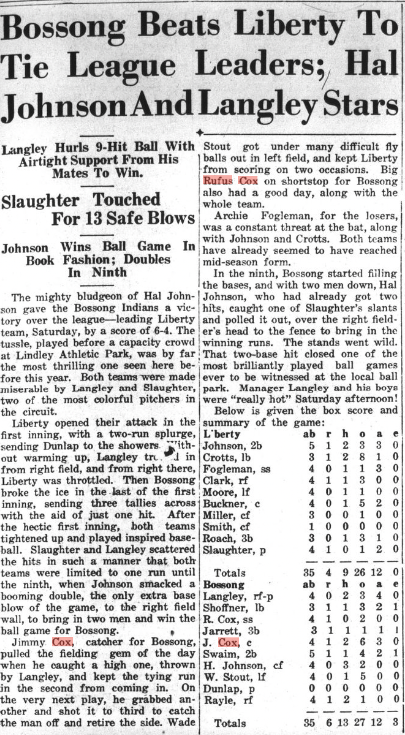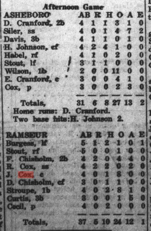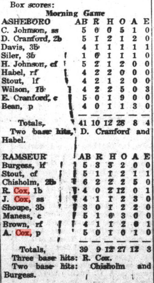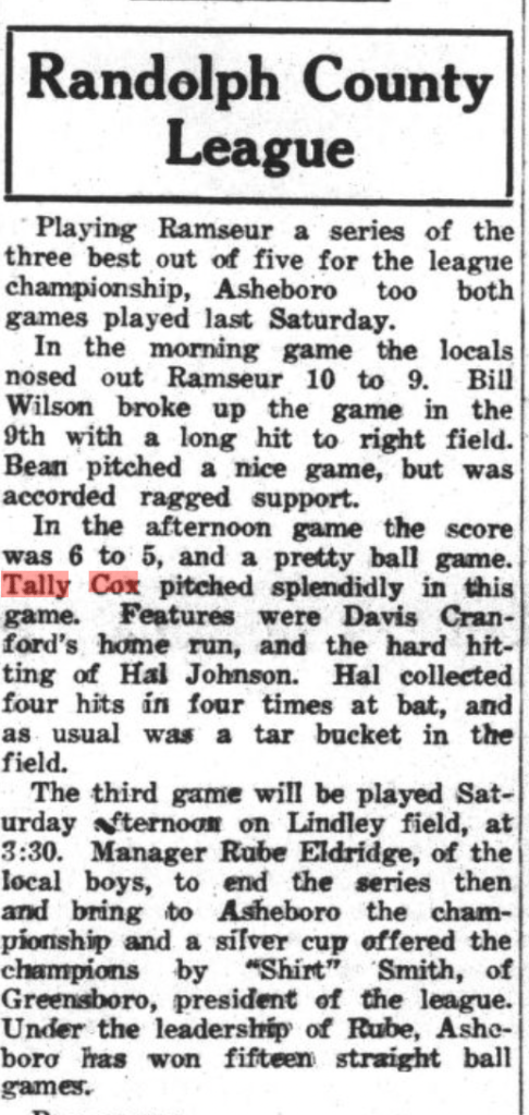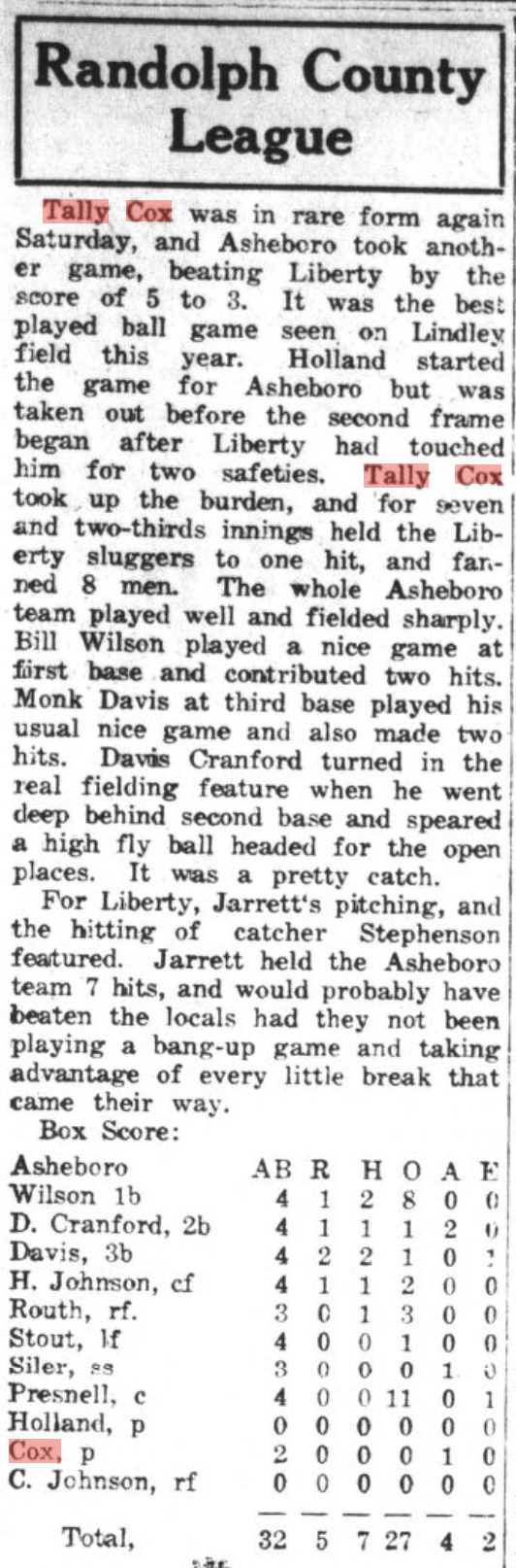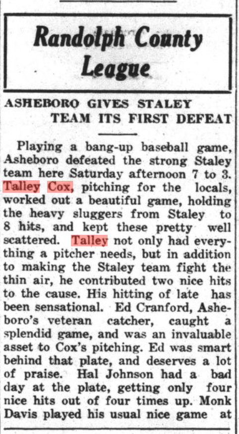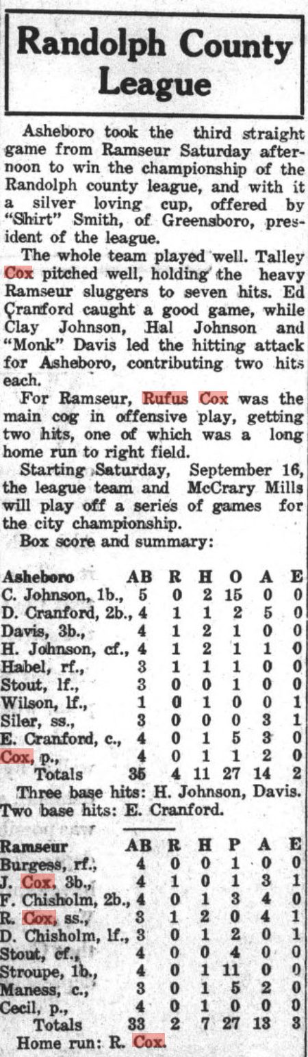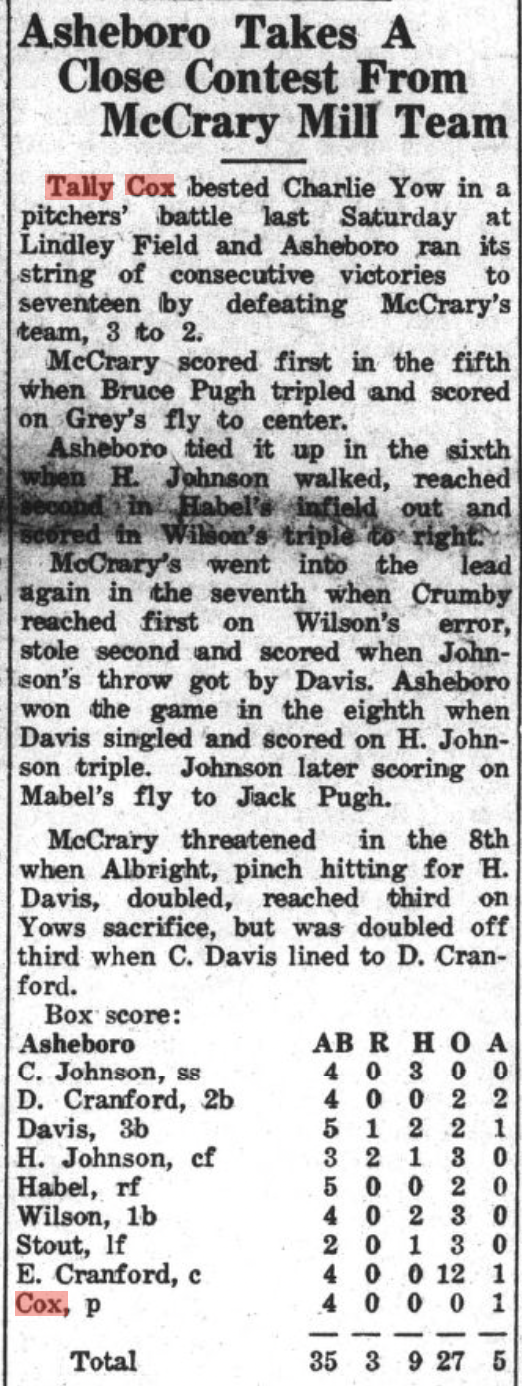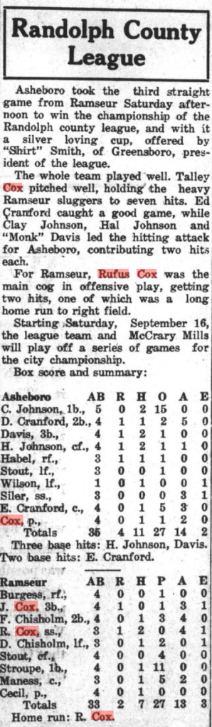 I have clippings from The Asheboro Courier mentioning their play, primarily 1930-1935 when the Cox brothers populated town and mill teams. (Click on any of the images to enlarge):