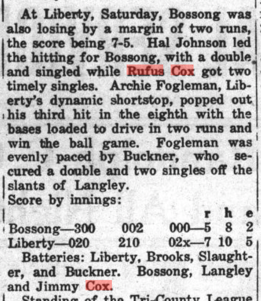 Talley and Jim (James), the last born of the Cox brothers, were close enough in age to have played together on school teams in the 1920s, and town or mill teams in the 1930s. Box scores from games in the 1930s often included four of the brothers: Arthur, Rufus, Talley, and Jim. Sometimes they were on the same team, and sometimes on opposite sides. Jim was often the catcher for either Arthur or Talley. My cousin Emily Johnson, Cecil’s daughter, says the boys sometimes were paid anywhere from $1 to $5 depending on whether they won or lost.
