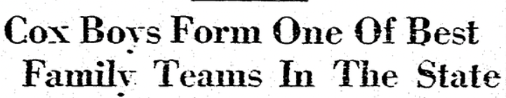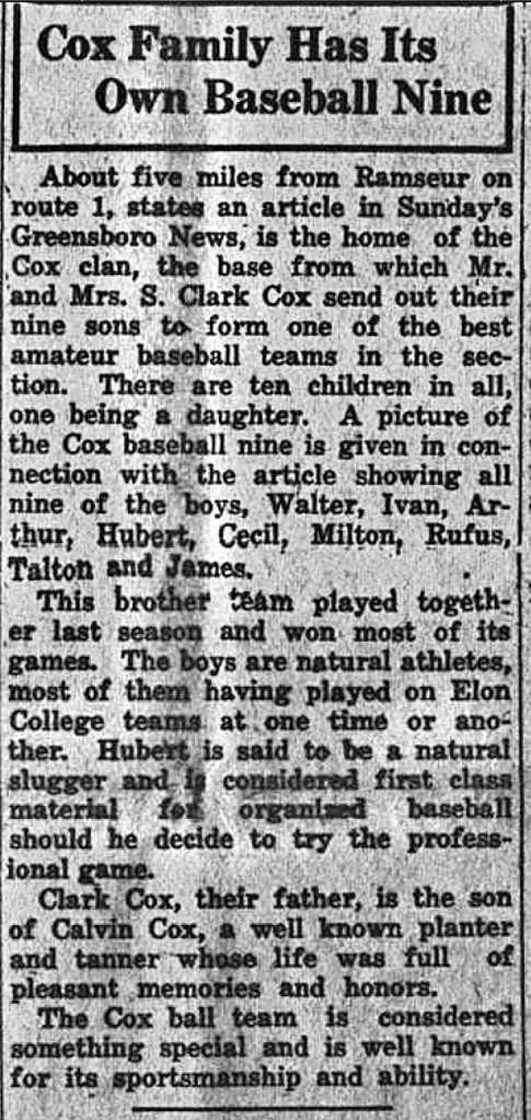 My father, Elvin Cox, told me stories about his uncles and how athletically gifted they were. My dad became an outstanding baseball player and credited his uncles for teaching him the game in the pastures on the family farm. The story goes that the Cox brothers team played or scrimmaged Elon College as well as other area “town” teams. Perhaps that’s why the article on the right mistakenly states “most of them having played on Elon College teams.” Only one of the brothers, Cecil, played at Elon.