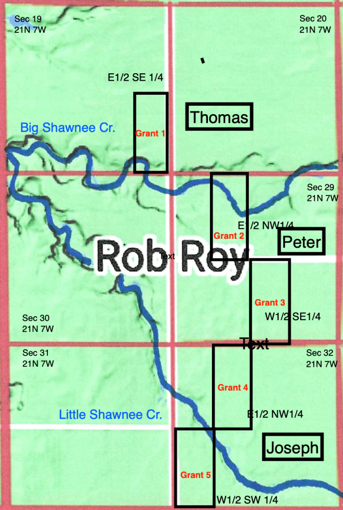 The map of Thomas, Peter and Joseph’s five grants place all in fairly close proximity to the Rob Roy community, just a bit upstream from where Big Shawnee and Little Shawnee Creeks flow together. The Thomas Cox 80 acre grant is just north of Rob Roy with a bit of the lower end of the grant crossing Big Shawnee Creek. This is one possible location for the Cox grist mill, and logically the reason this grant was chosen.