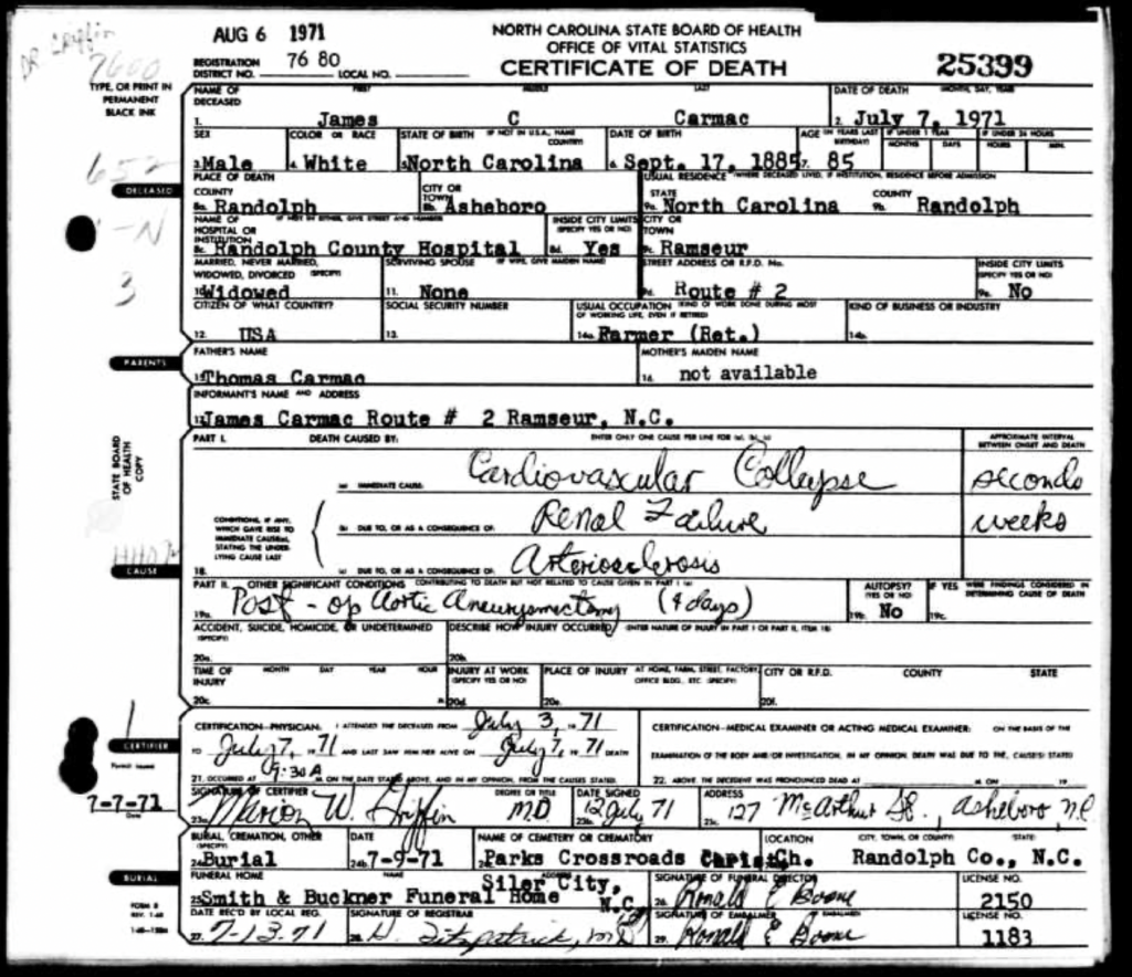 James died in 1971 at age 85 from heart failure. His death certificate listed his father as Thomas Carmac and his mother as “not available.”