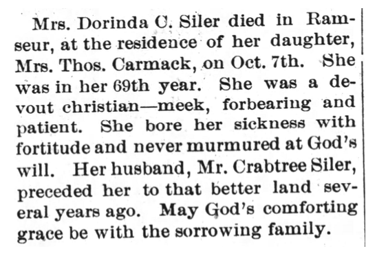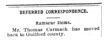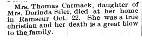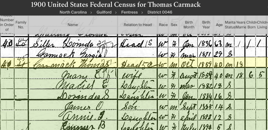 The 1900 census listed the Thomas Carmack family in the Fentress Township of Guilford County. It also noted children born (6,) and children living (5). Dorinda Cox Siler’s household was listed just above Thomas Carmac. That’s Thomas’ mother-in-law.