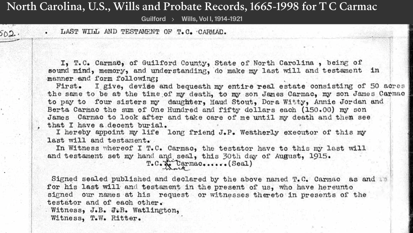 In November 2015 the land that Thomas owned was listed for sale in the Greensboro Patriot. The ad refers to “T. C.” instead of “T. N.” Carmac, but all the other details (James and his wife Fannie, the Whitty family, et. al.) confirm this was Sharon’s great-grandfather Thomas. The ad ran for several more months. He is also referred to as T. C. In his estate papers. Since the census records, his death certificate, and obituary were transcribed by 3rd parties, I believe the will and legal notice for the sale of his land are likely accurate.
