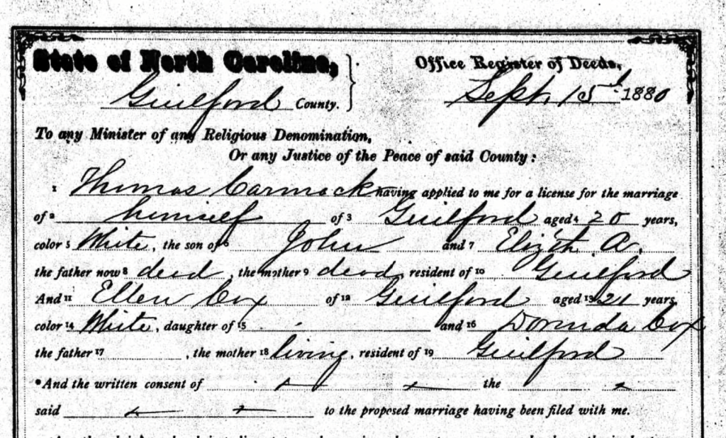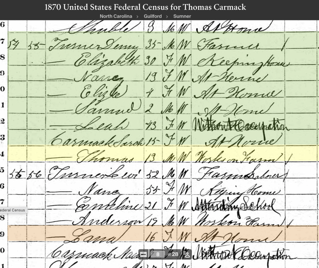 Thomas was not listed in the 1860 census with his parents and siblings, but in 1870 he was living in Guilford County’s Sumner Township in the Newton Denny Turner household with his sister Sarah. (He is later recorded as Thomas “Newton” Carmack further suggesting the connection to Elizabeth’s brother.) His sister Nancy is in the Levi Turner household next door in 1870, and again in 1880 listed as “niece.” John and Elizabeth died before 1870, although I can’t find the specific records. But I can’t think of another reason they disappeared from census records while their children show up in the households of Elizabeth’s siblings.