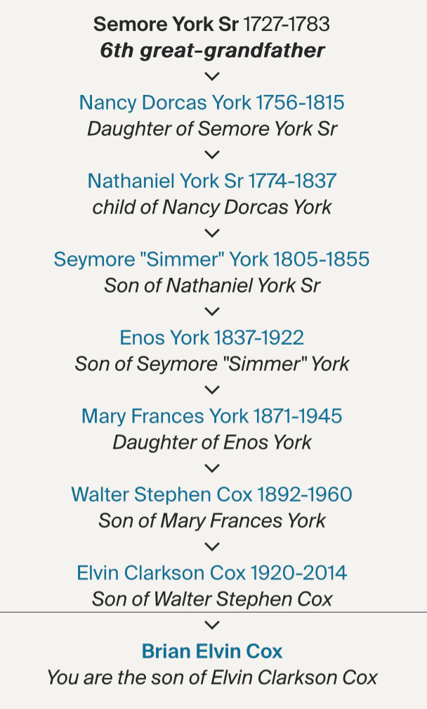 Semore was one of ten children with sisters Hannah Jane (1722), Elizabeth Ann (1726), Sarah (1735), and brothers Elijah (1723), Jesse (1724), Thomas (1729), Jeremiah (1730), Henry (1732), and Joseph (1734). His parents moved the family from Chester County to the Monocacy Valley settlement in Northern Virginia in the early 1730s. I could go down a rabbit hole regarding the accompanying twists and turns, but the gist is there was a dispute between Pennsylvanioa and Maryland over property rights and taxes in the border area where the Yorks lived. (I’ll write about Semore’s parents sometime in the future.)