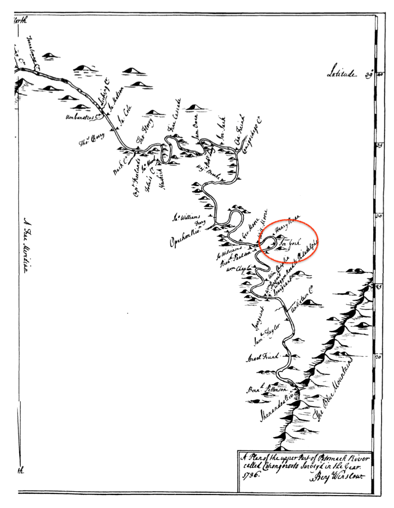 The York family chose to settle on a tract of land overlooking the Potomac River that became known as Terrapin Neck, part of 100,000 acres granted conditionally by the Virginia Council to Jost Hite and Robert McKay in October 1731. When Lord Fairfax arrived in Virginia from England in 1735, he was surprised to find Hite and McKay brokering property for which he had a inheritance claim. The resulting legal battle lasted several decades, and it would take until 1751 for Semore’s father to officially secure a grant for the land where the family lived. The map on the right is from a 1736 survey commissioned by Fairfax and the York location is circled.