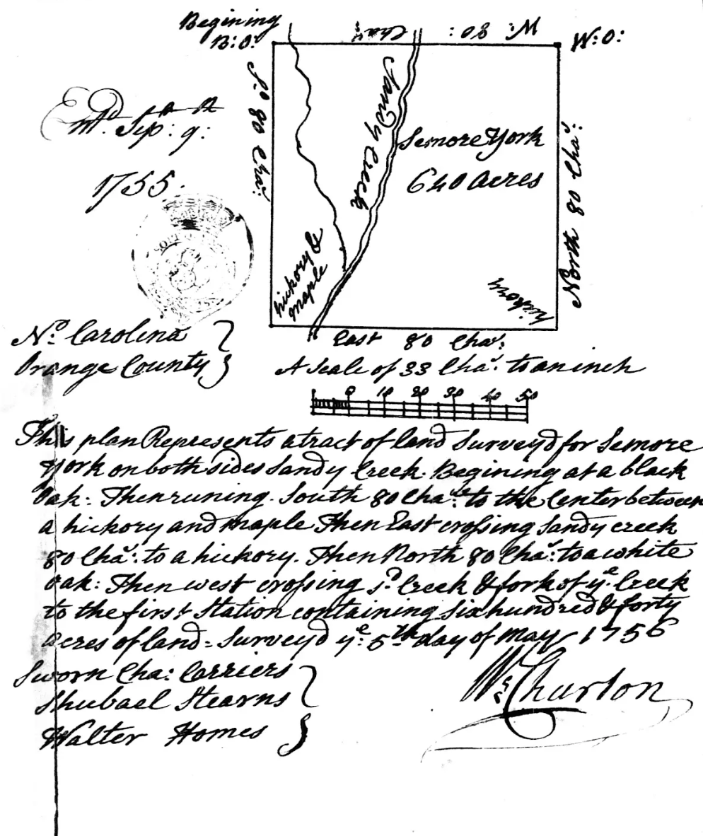 Granville to Seymore York, 5 Aug 1758, 640 acres on both sides of Sandy Creek, Survey Chain Carriers: Shubal Stearns and Walter Homes, surveyed on 6 May 1756 by William Churton.