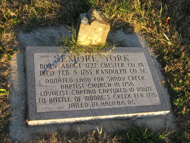 Semore York died on February 5, 1783 and is buried at Sandy Creek Baptist Church a few feet northeast from the original church building site. The original stone gravemarker is inscribed “S Y, 8 Feb 1783” and is accompanied by a modern memorial. Sylvania died in 1791, but the exact date is not recorded on her headstone.