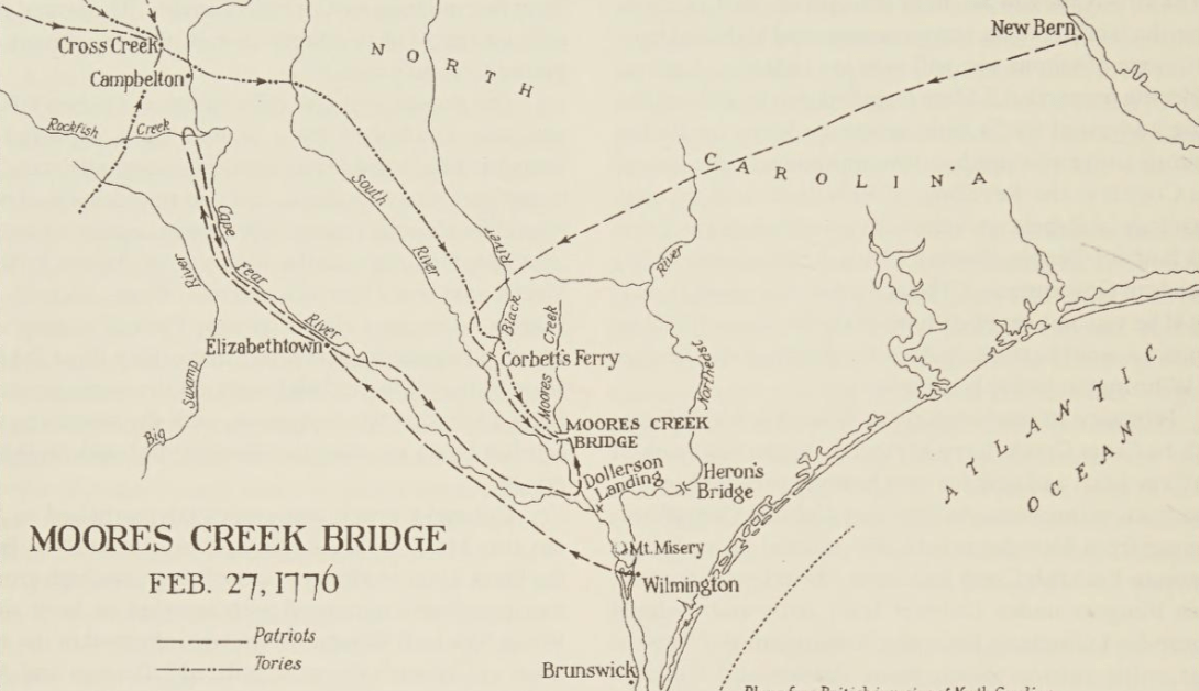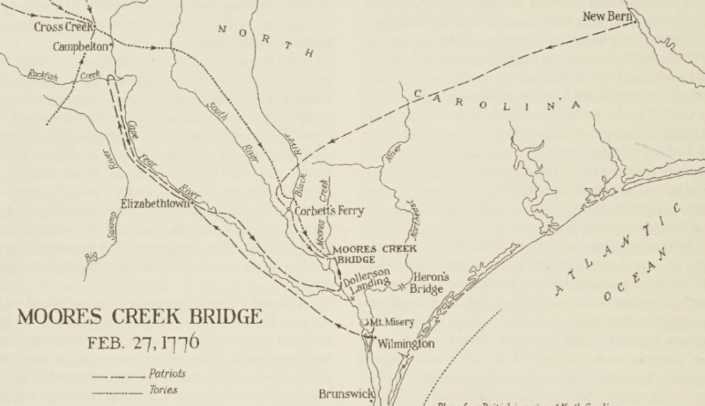 Somewhat ironically, these former Regulators found themselves on the side of the Crown as loyalist Tories. (Jeremiah Fields said in his old age that “he had fought twice, once for his country and once for the King, and been defeated each time, and that he would fight no more.”) Semore York served as British Captain and was among roughly 1600 loyalists responding to Governor Martin’s call for support in eastern North Carolina.