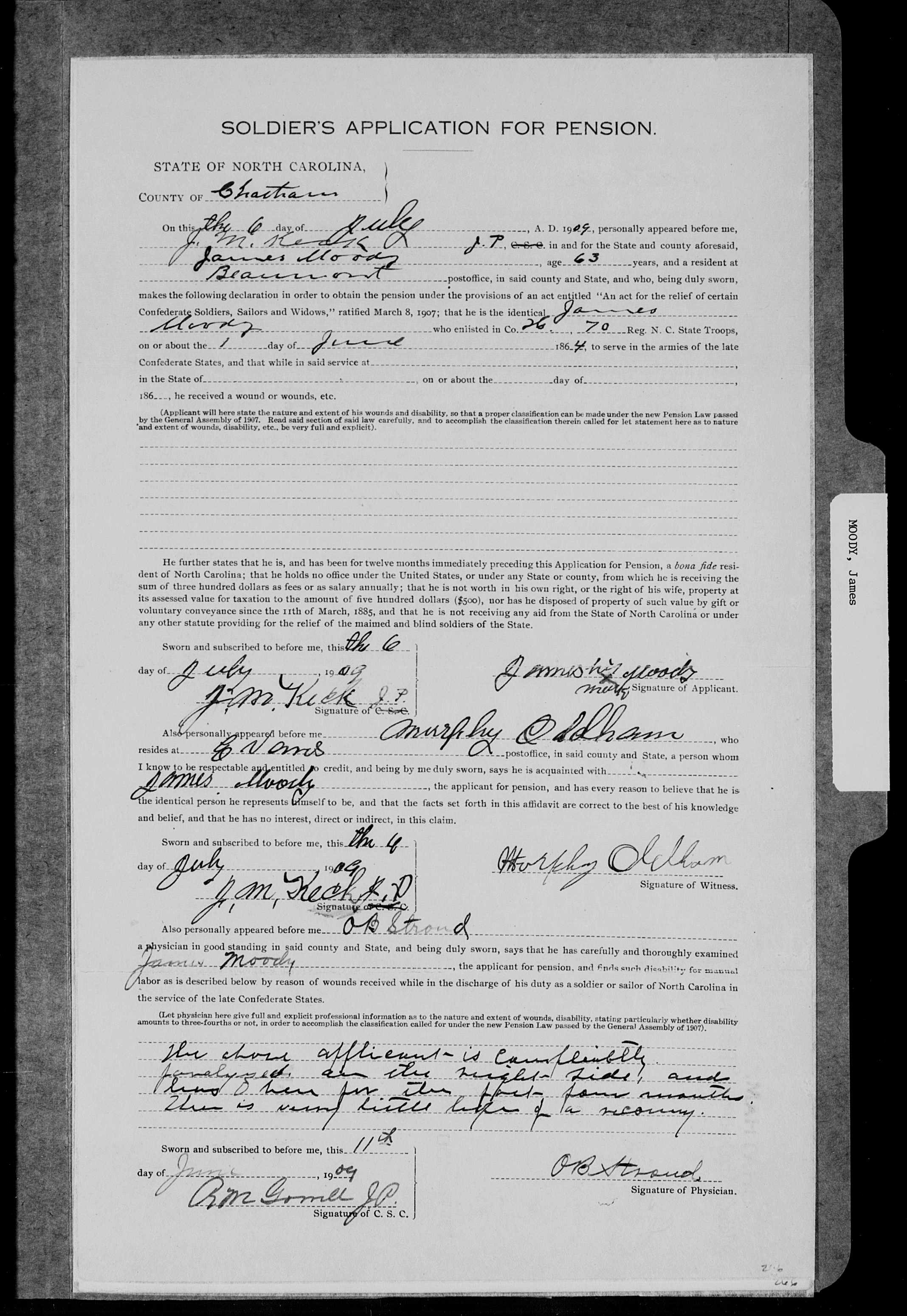 James was born on November 5, 1846, to Elisha and Millie Thomason Moody in the Bear Creek area of Chatham County, NC. He was the ninth of twelve children. The Moodys lived on a small farm worked by family members rather than enslaved labor. The 1860 census shows that James was the oldest son still residing in the household, so a lot of the farm’s workload probably fell on his shoulders.
