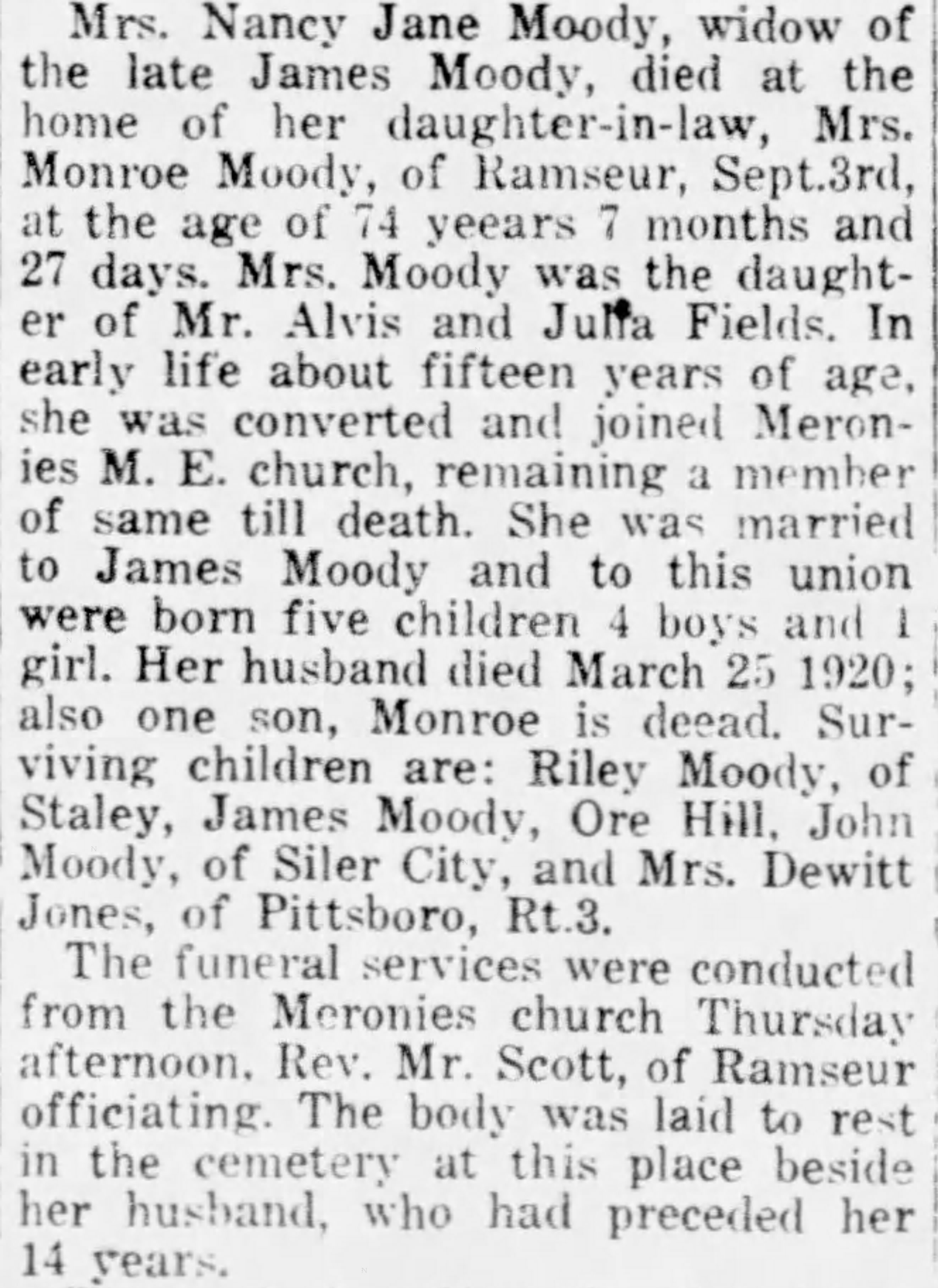 Nancy lived on the farm with William until around the time of his marriage to 16-year-old Retta Dunn in 1914. (William was 42, so there’s got to be a story in there somewhere). In November 1921, Nancy filed for and was approved to receive a “widow’s pension” with the State of North Carolina for James’ service in the Confederate army. Nancy then lived with my great-grandparents, Henry and Emma (Mitchell) Moody, until her death at age 74 on September 3, 1924.