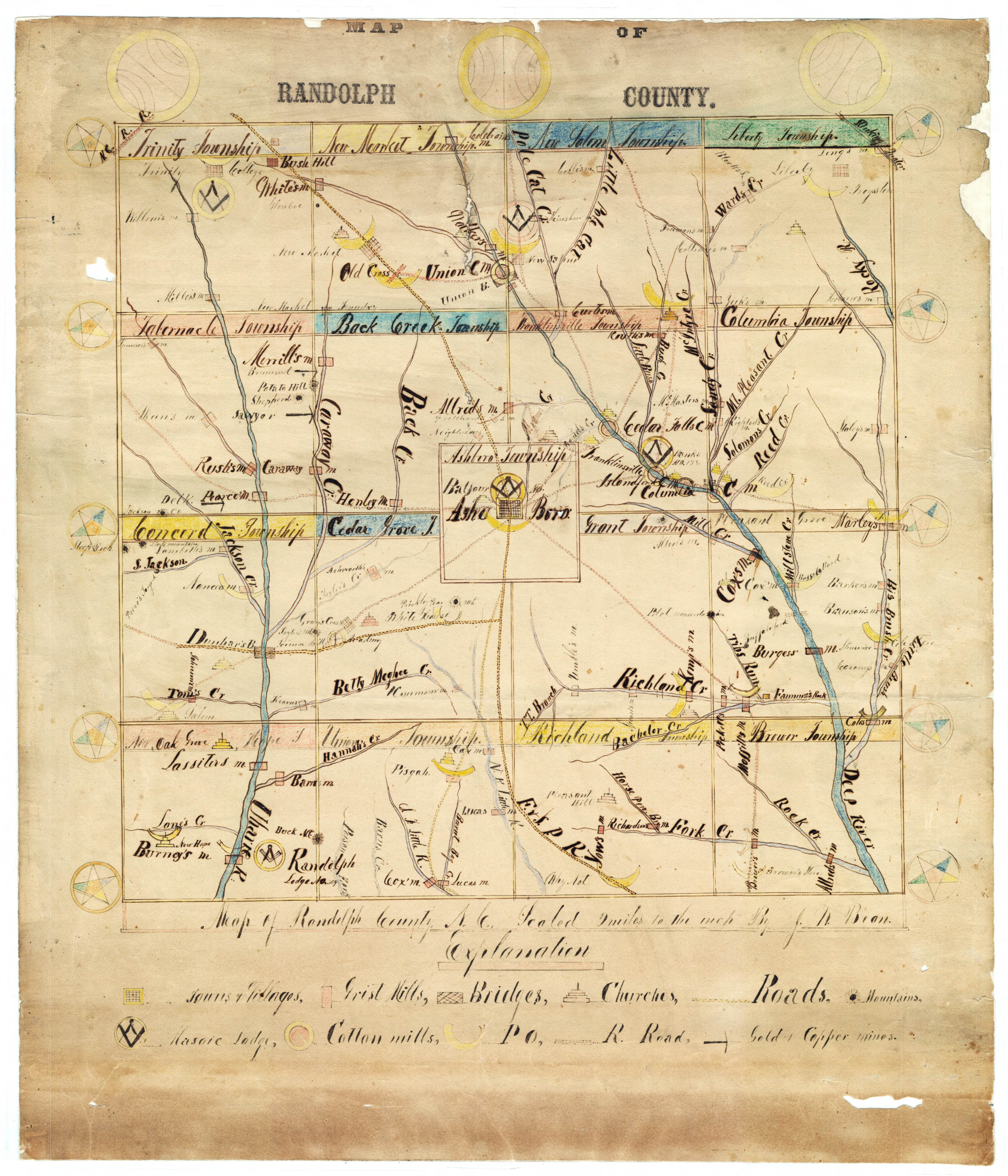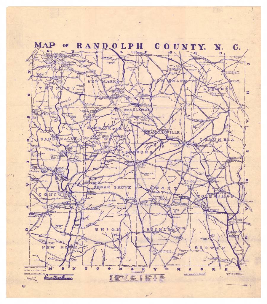 Map of Randolph County, NC (J. W. Bean), circa 1873, with Cox’s Mill identified.