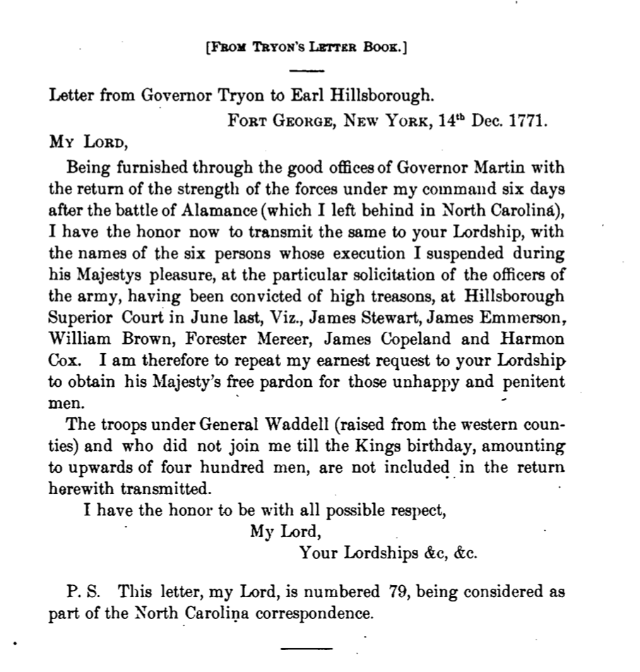 “To His Excellency Wm Tryon Esqre Governor & Commander in Chief over the Province of North Carolina. Whereas thro’ the exactions & extortions of several Officers of Orange, we have involved ourselves in many difficulties and by means of reports, falsely spread the contention has arose to a great extremity & being desirous to submit ourselves to the clemency of your Excellency, and to lay aside all method of redress of our grievances, but by a due course of Law and beg that your Excellency will forgive all our past offences by your gracious Proclamation, that peace and tranquility may be restored again, to all the Inhabitants of this Province, and confiding in your assistance and favour to execute the Laws against said exactions and extortions and conclude, Your dutiful Petitioners”