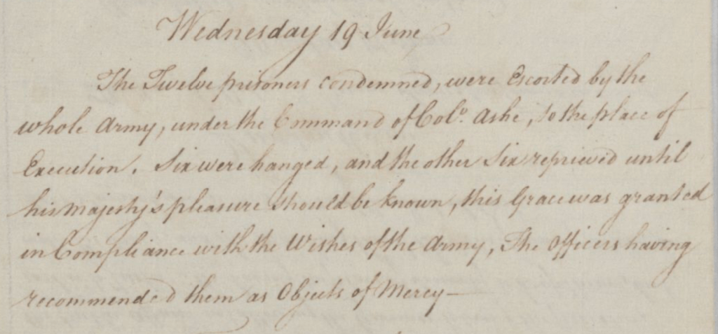 “The twelve prisoners condemned were escorted by the whole Army, under the command of Col. Ashe, to the place of execution, six were hanged and the other six reprieved until his Majesty’s pleasure should be known; this grace was granted in compliance with the wishes of the Army, the Officers having recommended them as objects of mercy.”