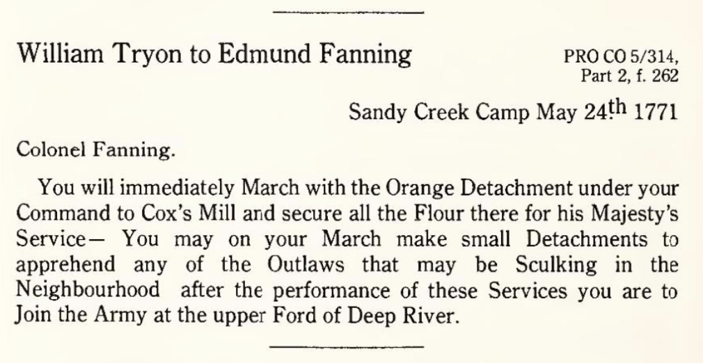 “Mr. Hermon Cox, You are to see that the Settlers on Deep River and Richland Creek (who sent the Flower required by His Excellency the Governor from those Settlements for the use of His Majestys Forces) pay to Adam Andrews and Peter Foncannon the Sum of Six pounds proclamation Money each, it being for the Hire of their Waggons which you pressed 768 to send the Flower by to the Army, which is at the rate of Fifteen shillngs per Day for each Waggon, the same that is allowed for the Waggons that attend the Army. This You are strictly required forthwith to comply with, in confidence whereof the Governor has released your Son. Mr Andrews has orders to make Report if you do not immediately comply with this Requisition. By Command of His Excellency, Edwards Bethabara. 5 June 1771″
